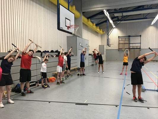 Am Freitag, den 10. Mai 2019, hatten wir eine ehemalige Trainerin aus dem Leistungs- und Rhönradturnen bei unserem Training zu Gast. Sie hat mit unseren Spielerinnen und Spielern erst ein allgemeines Dehnprogramm durchgeführt und ist am Ende noch verstärkt auf die besonderen Anforderungen im Badminton eingegangen. Der ein oder andere wurde bei diesen Übungen wirklich an seine Grenzen geführt. Auch uns Trainern gab sie wertvolle Tipps, welche Übungen wir in Zukunft ins Training einbauen können.